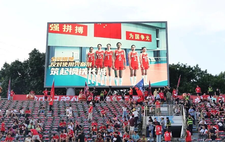 走进场馆,“禁毒+反兴奋剂”的声音更是无处不在,高处悬挂的巨型横幅格外醒目;LED大屏循环播放奥运冠军“禁毒+反兴奋剂”公益宣传片……