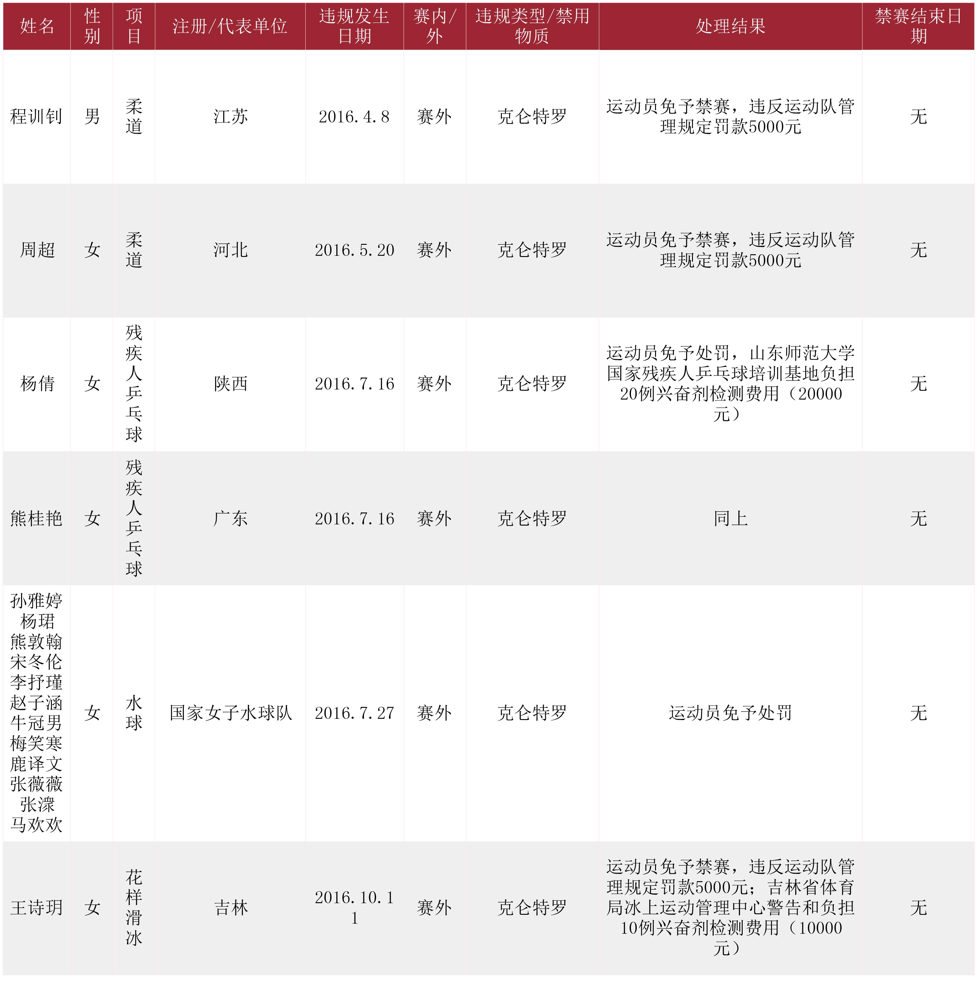 近日,相关单位对下列运动员克仑特罗阳性做出处罚决定。