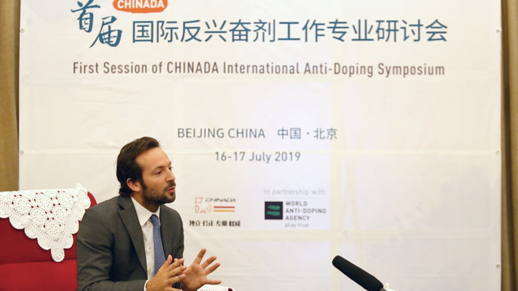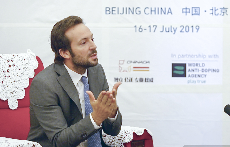 2019年7月17日,首届国际反兴奋剂工作专业研讨会在京举行,国际检查机构总干事科恩接受采访。新华社发(张旭摄)