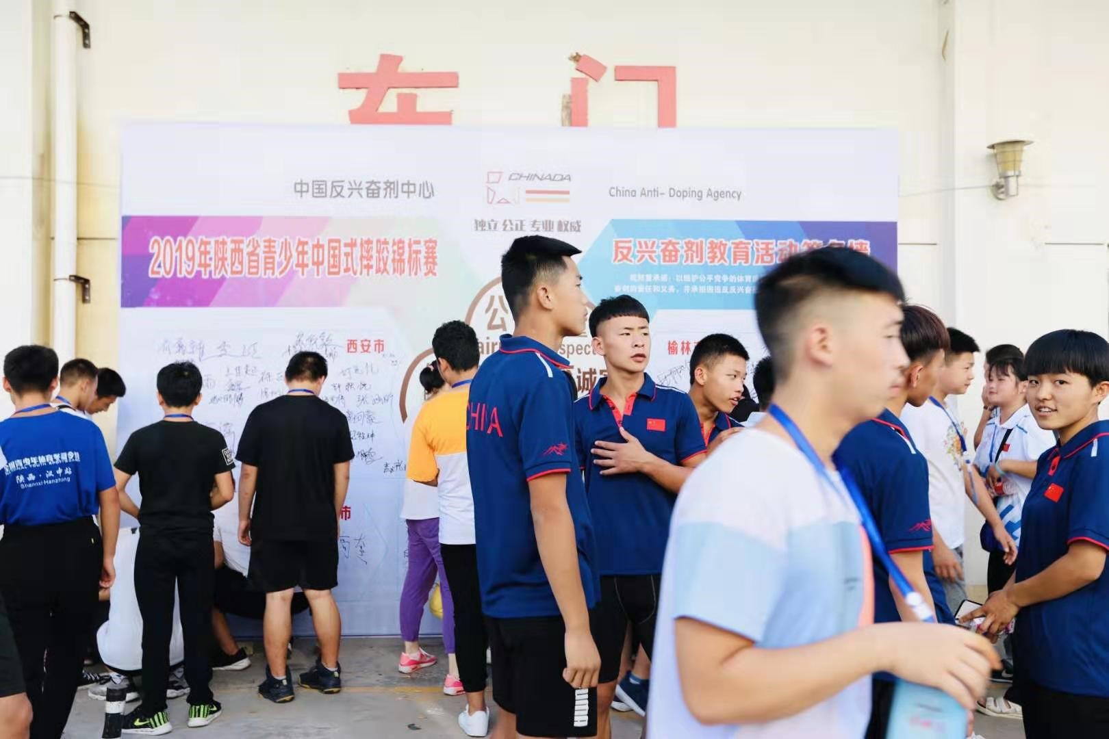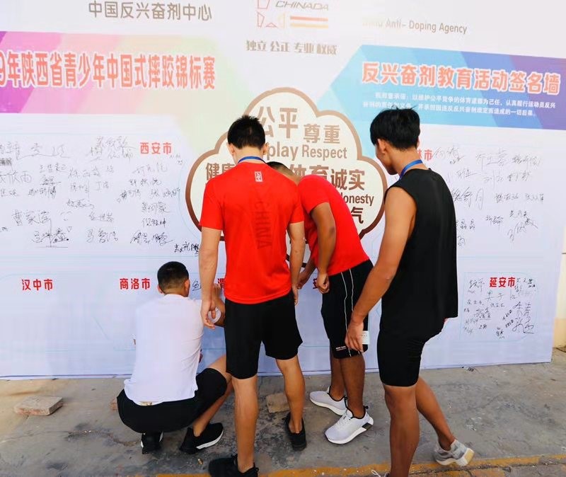 2019年陕西省青少年中国式摔跤锦标赛于8月13日—17日在陕西省榆林市举办,为做好本次比赛的反兴奋剂宣传教育工作,倡导“纯洁体育”精神,让运动员更好的理解“拿干净金牌”理念,在省体育局反兴奋剂中心指导下,榆林市体育局和赛事组委会于8月15日在榆林市全民健身活动中心体育馆东门外组织了2019年陕西省青少年中国式摔跤锦标赛反兴奋剂教育拓展活动。