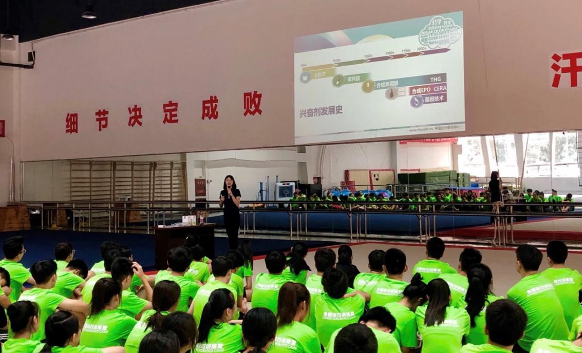 2019年8月21日,国家级纯洁体育讲师杜莉在成都为参加“2019年全国技巧教练员培训班暨青少年暑期技巧训练营”的运动员及教练员共计150余人开展了反兴奋剂专题教育讲座。