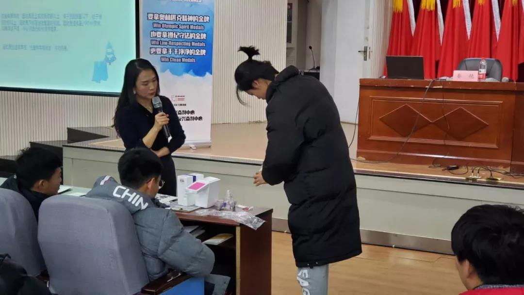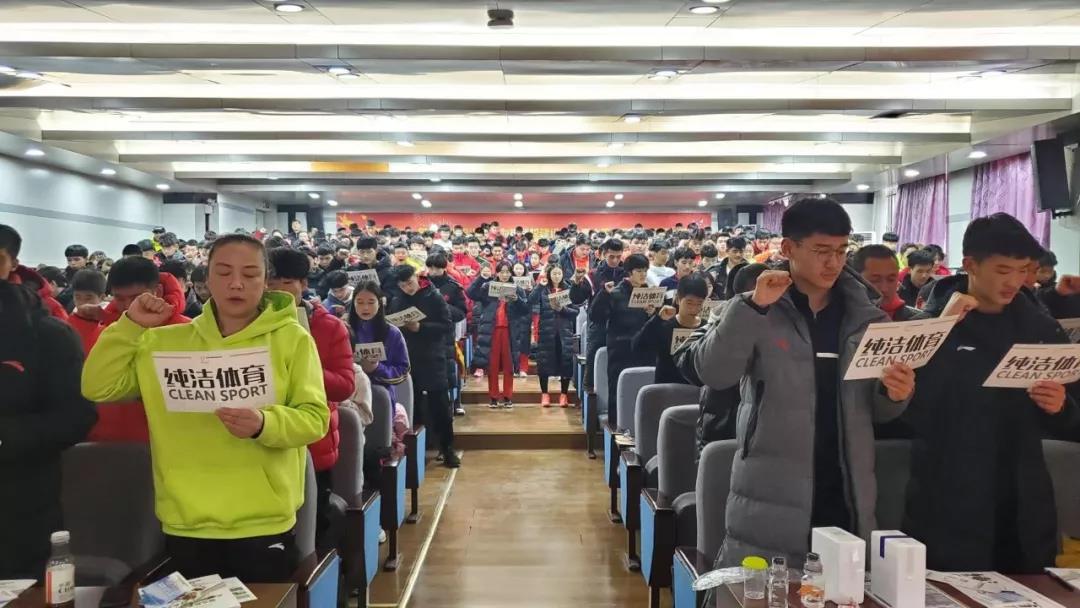 本次反兴奋剂知识宣传讲座由反兴奋剂国家级讲师、国家级纯洁体育讲师、陕西省反兴奋剂中心省级检查官秦艳主讲。培训中,秦艳老师详细介绍了反兴奋剂的“六项规定”以及兴奋剂的种类、危害、监督等知识。并与现场运动员交流互动,演示了反兴奋剂尿检程序、反兴奋剂知识答题等环节,为大家带来了一场生动的反兴奋剂知识讲座。讲座结束后,发放了《兴奋剂检查中运动员权利与义务手册》,反兴奋剂纪念品。所有参加培训人员在中华人民共和国国旗下进行庄严宣誓,坚决抵制兴奋剂,并签署了《反兴奋剂承诺书》。
