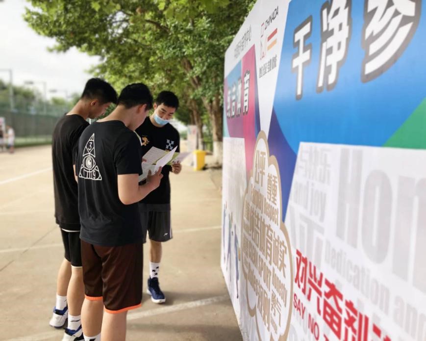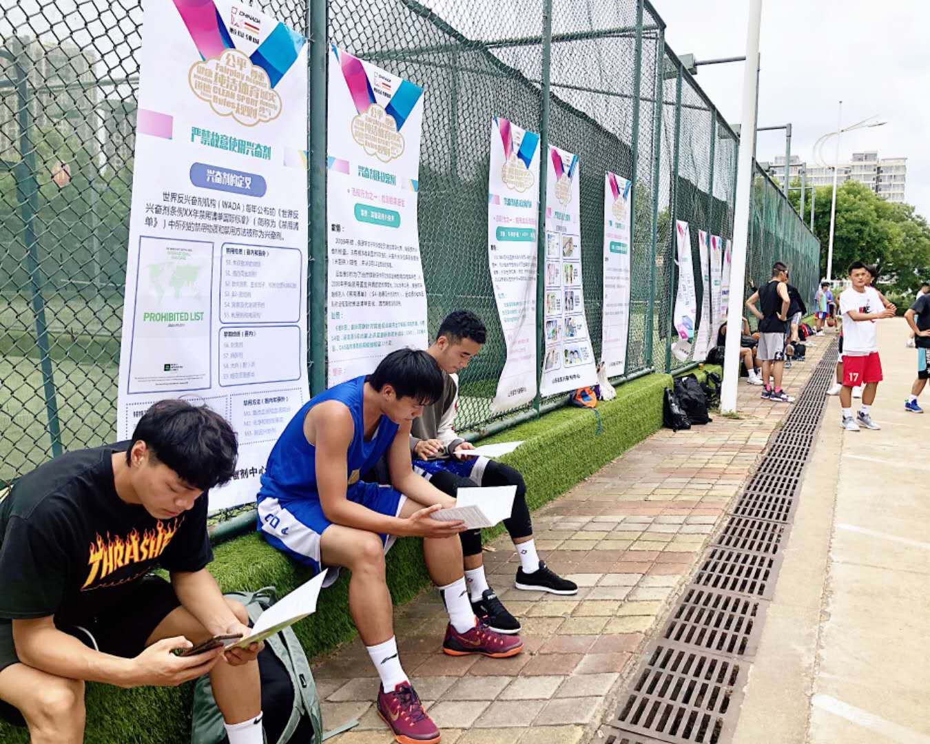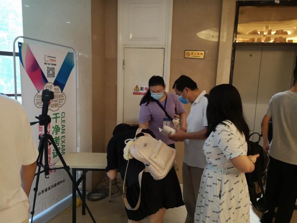 在棋类项目考点,考场内和考场外都有门型架和横幅布置,让运动员无论报到排队和考试间隙,还是在候场区和考场内都可以看到有关兴奋剂的知识和信息。此考点还为考生家长分发了反兴奋剂知识的折页和法律法规手册,让家长也能了解和重视兴奋剂的危害。