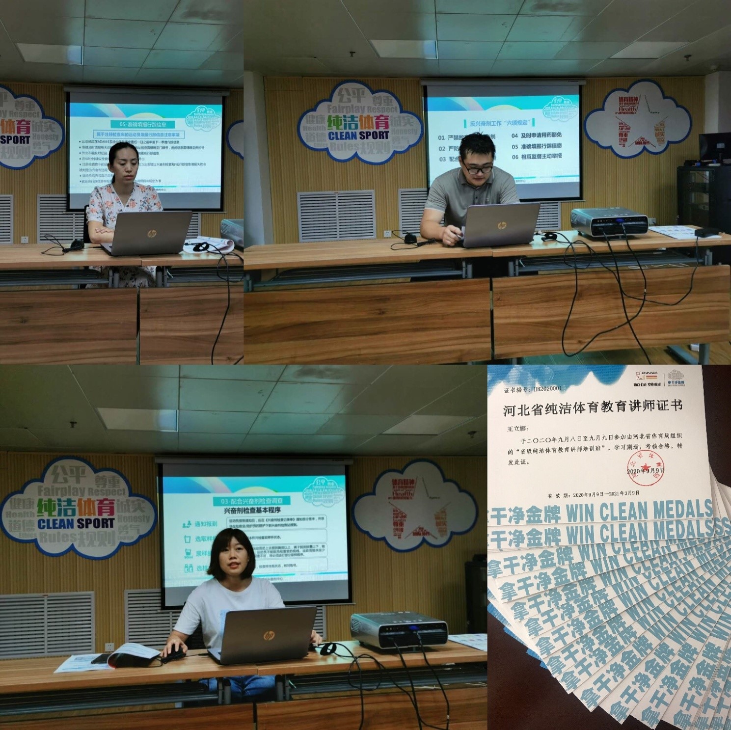 此次培训采取笔试和试讲相结合的考核方式,对全体学员进行考核,试讲内容为反兴奋剂六项规定,通过抽签确定试讲具体章节。学员们分两组进行试讲考核,每组考官根据学员的试讲表现进行打分,对笔试和试讲合格的学员颁发河北省纯洁体育教育讲师证书。