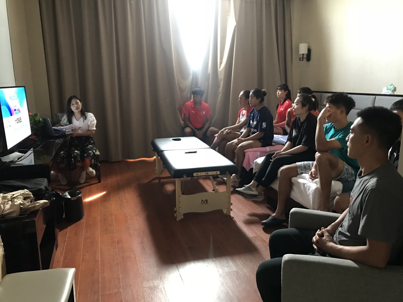 宣讲小组克服运动队在外训练的不便条件,就近在运动员的酒店房间、训练场地,通过电视投屏、发放课件资料等手段,采取灵活的“小班教学”模式进行培训。队员们围坐在讲师身边,全神贯注听讲,接受知识快,学习效果好。