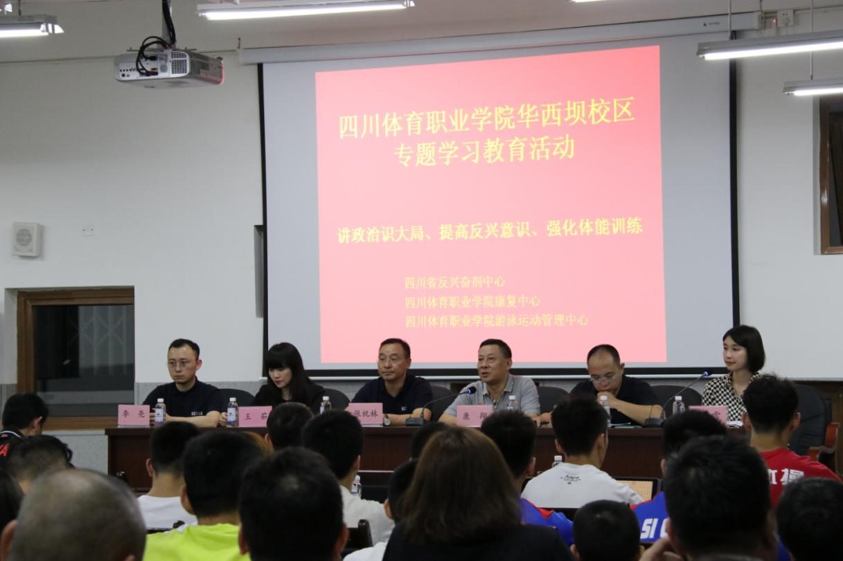 四川体育职业学院副院长康翔介绍了体职院竞赛情况及体能备战情况,对反兴防兴和体能训练提了具体要求;省体育局调研员张祝林以《仰望星空、脚踏实地,做一个干净、优秀的体育人》为题,勉励运动员成为四川体育浩瀚星空中的明星;省反兴奋剂中心主任王茹对提高政治意识,反兴奋剂工作怎么做提了明确要求。本次学习教育活动由游管中心竞训科组织安排,首次以纵横交叉、上下联动、全覆盖形式深入至各项目队,活动涵盖游泳运动管理中心和体操运动管理中心的239名运动员及辅助人员,年龄跨度达到了50岁。