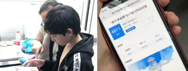 在反兴奋剂知识答题游戏互动环节中,青少年运动员们积极踊跃,拿出手机,认认真真地回答问题,不一会儿,大家就把题目答完了,还诞生了好几个100分。