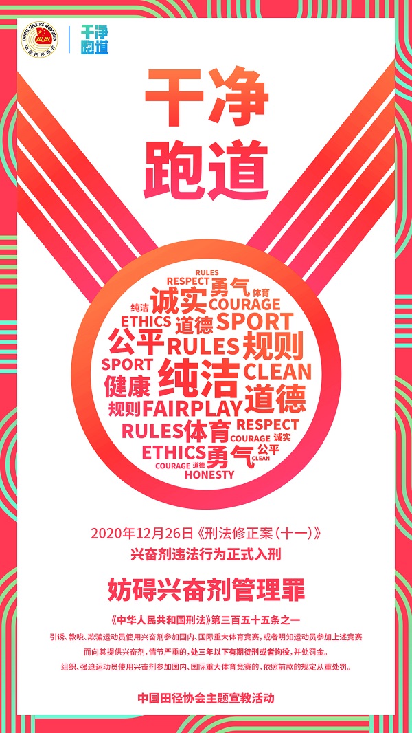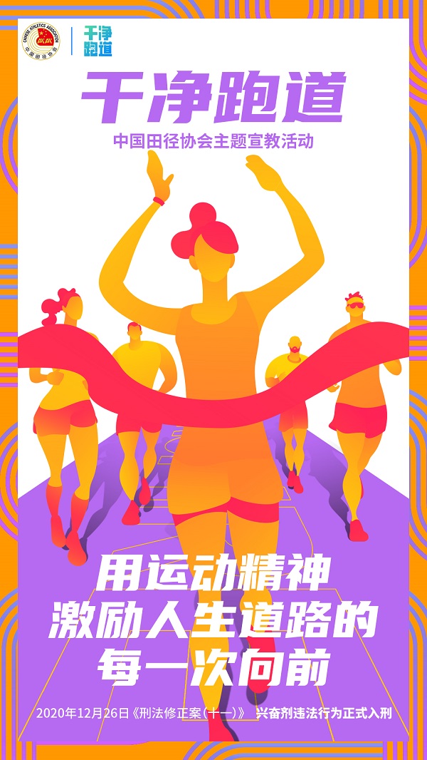 目前,“干净跑道”主题宣教活动的相关宣传海报已在中国田径官网上线,欢迎大家免费下载使用。
