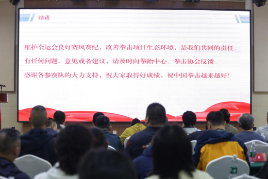 本次会议为期两天,23日晚组织参会人员就十五运拳击项目赛风赛纪和反兴奋剂相关工作展开讨论。24日上午进行拳击项目竞赛与技术规则讲解及答疑,山东、河南、贵州作为参赛队代表分别发言。