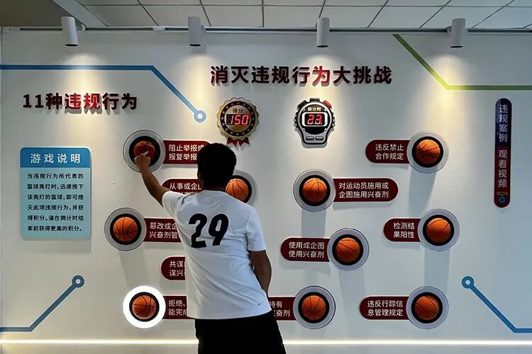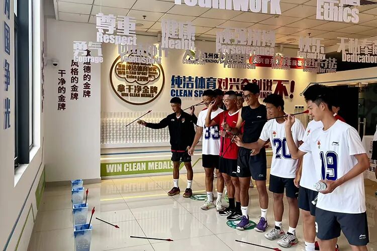 活动现场设置了“体育精神主题投壶”“拿干净金牌主题套圈”“消灭风险大作战”等互动游戏环节,旨在使青少年运动员、辅助人员在轻松愉悦的氛围中巩固所学。其中,一位教练在套圈游戏里精准套中“为国争光”的体育精神目标牌,引发全场欢呼。此场景不仅活跃了现场气氛,更将中华体育精神内核和纯洁体育理念深植于青少年运动员心中。