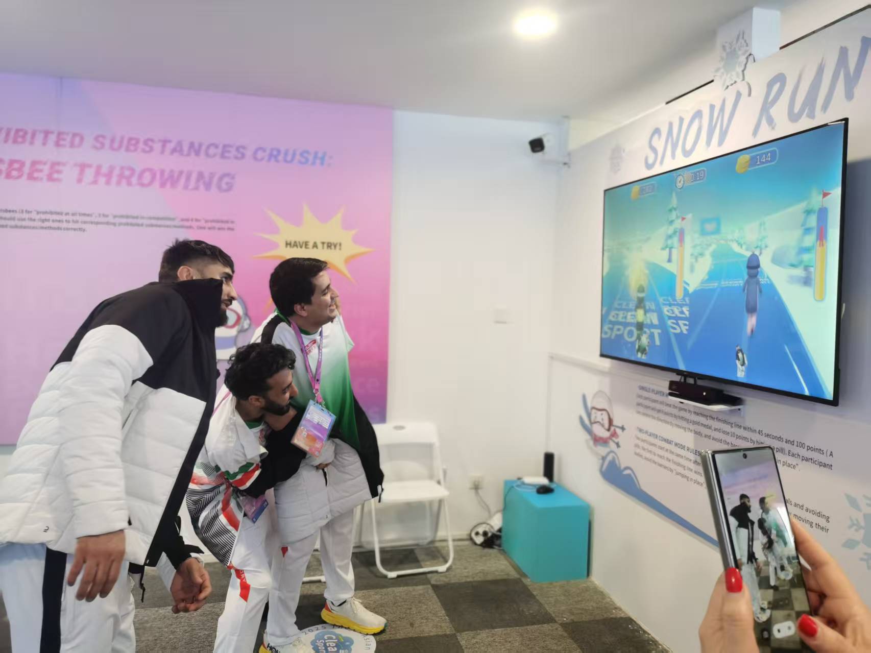 比如体感游戏形式的跑酷游戏,就是运动员通过移动身体收集更多的“干净的金牌”来获得分数,同时避开种种象征禁用物质的障碍。